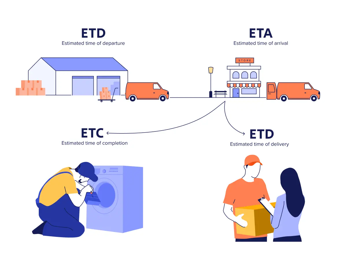 물류 분야에서도 마찬가지예요. 예를 들어 "화물의 ETD는 내일 오전 8시, ETA는 모레 오후 2시이고요"라는 문장은 화물이 언제 출발하고 언제 도착할지를 알려줍니다. 이를 기본으로 기업은 재고 관리나 고객 서비스를 능률적으로 할 수 있어요.