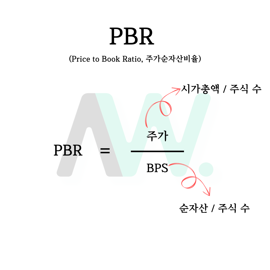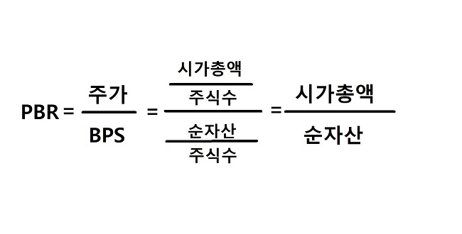 이제 PBR에 대해 알아볼게요니다. PBR이란 주가순자산비율(Price to Book Ratio)을 뜻하며 주가를 주당순자산(BPS, Book Value Per Share)으로 나눈 값이에요. PBR은 회사의 자산 가치에 비교하여자면 주가가 얼마나 높은지를 보여주는 지표이고요.