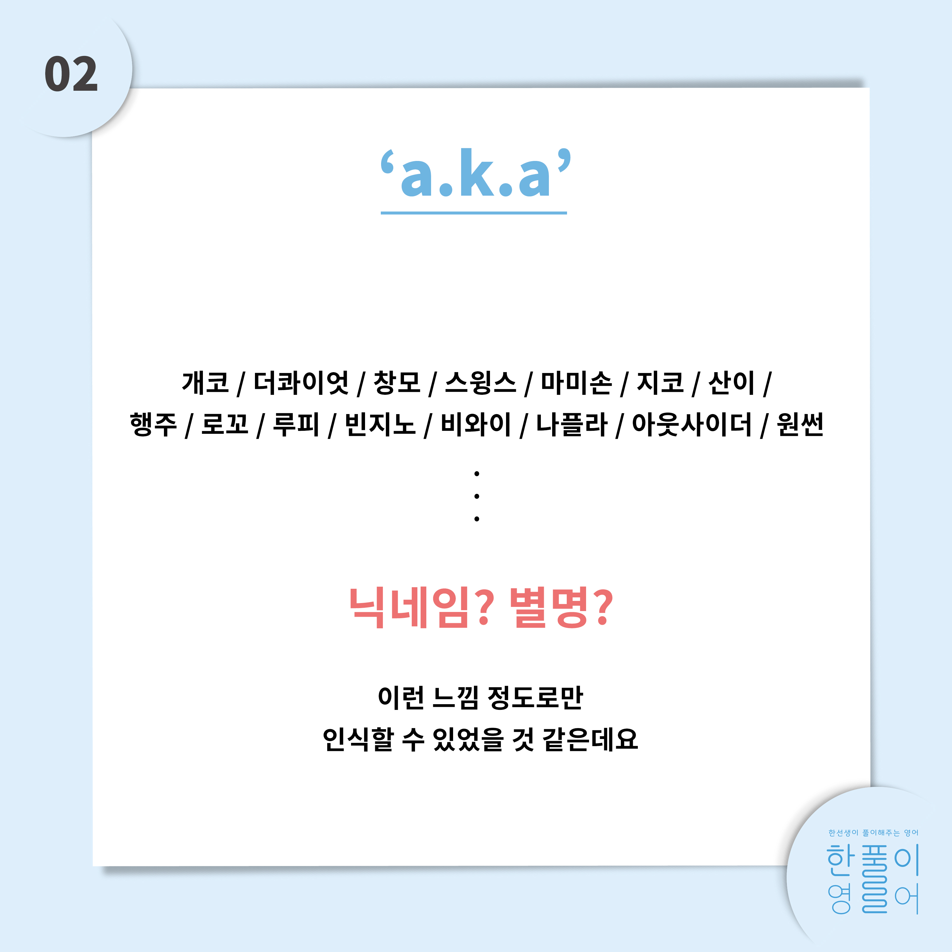 ✔ AKA 뜻: ‘Also Known As’로 별명이나 다른 이름을 소개할 때 사용