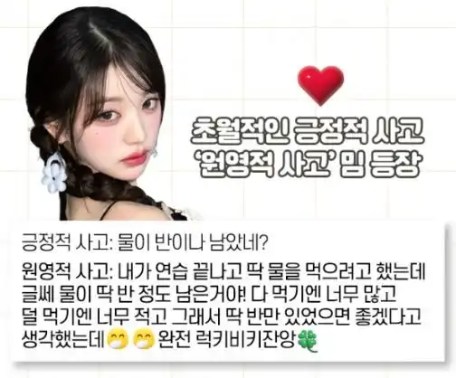 원영적 사고란 장원영의 초낙관적인 사고방식을 뜻하는 말로, 보편적인 긍정 마인드를 넘어선 초월적 낙관주의를 의미하더라고요.